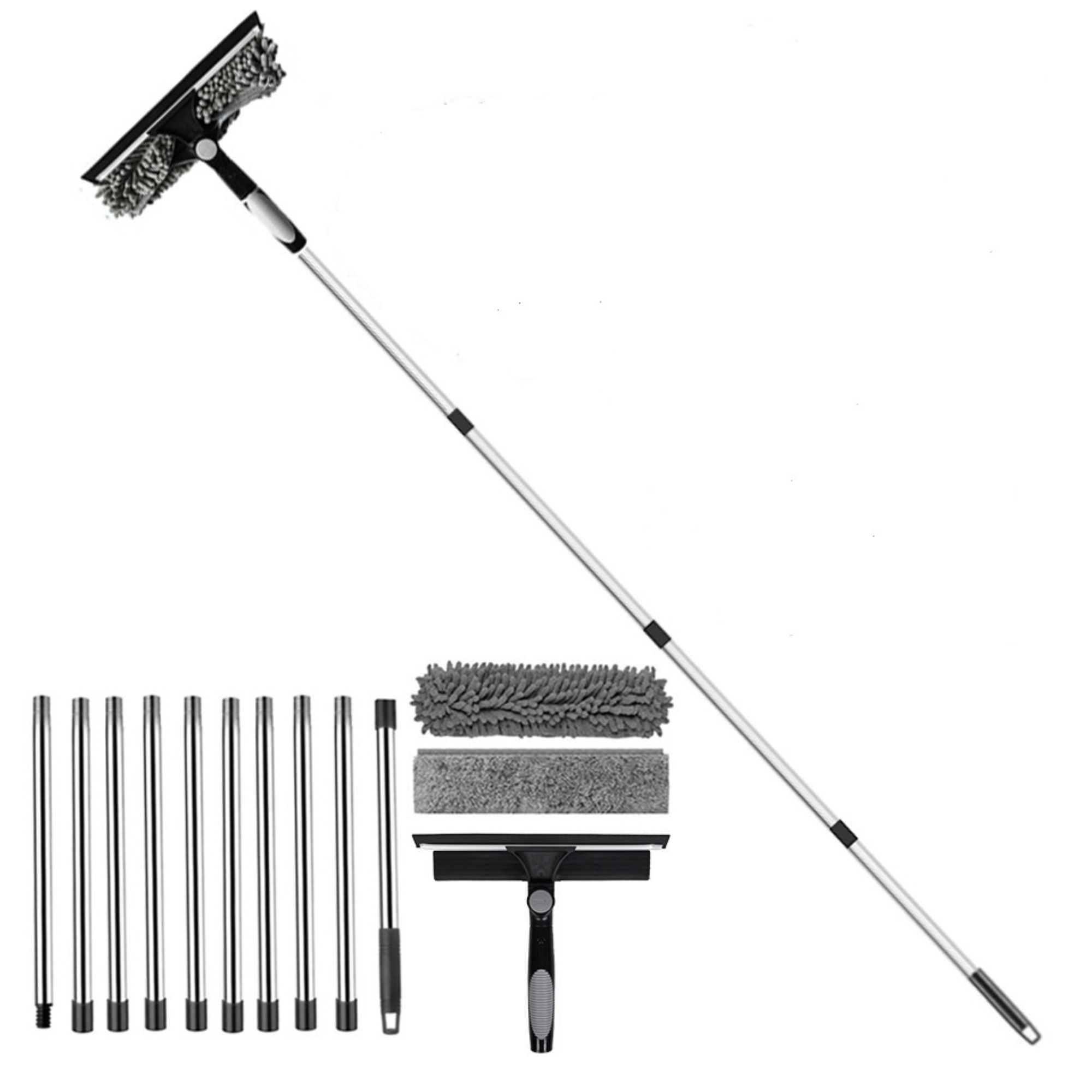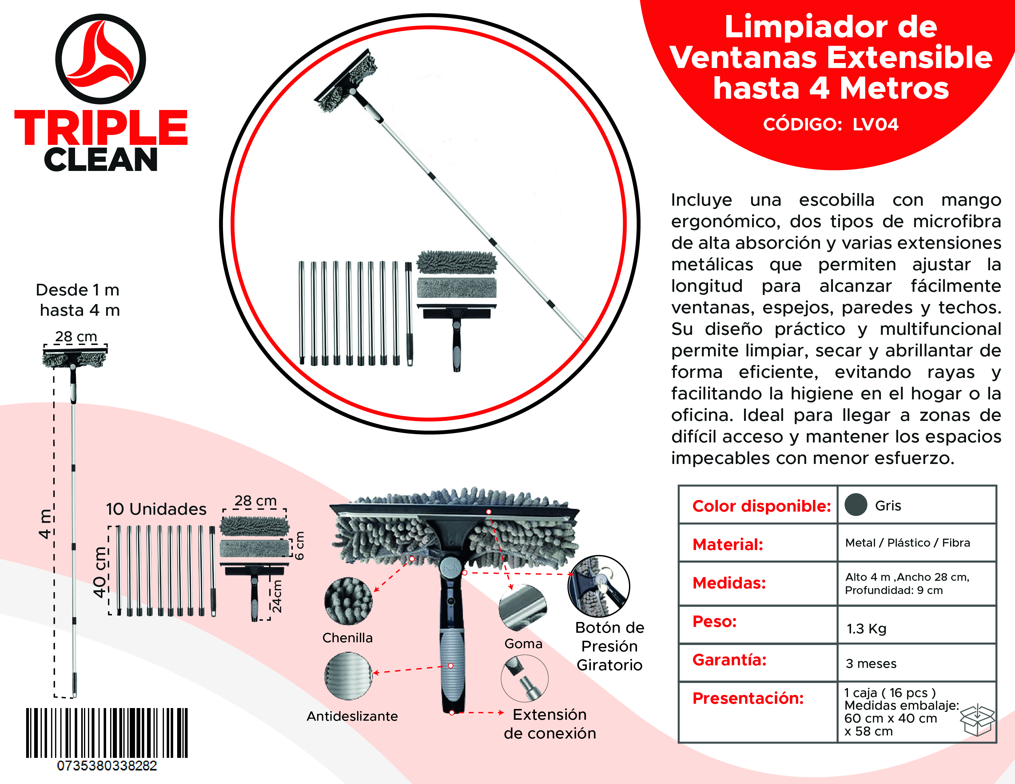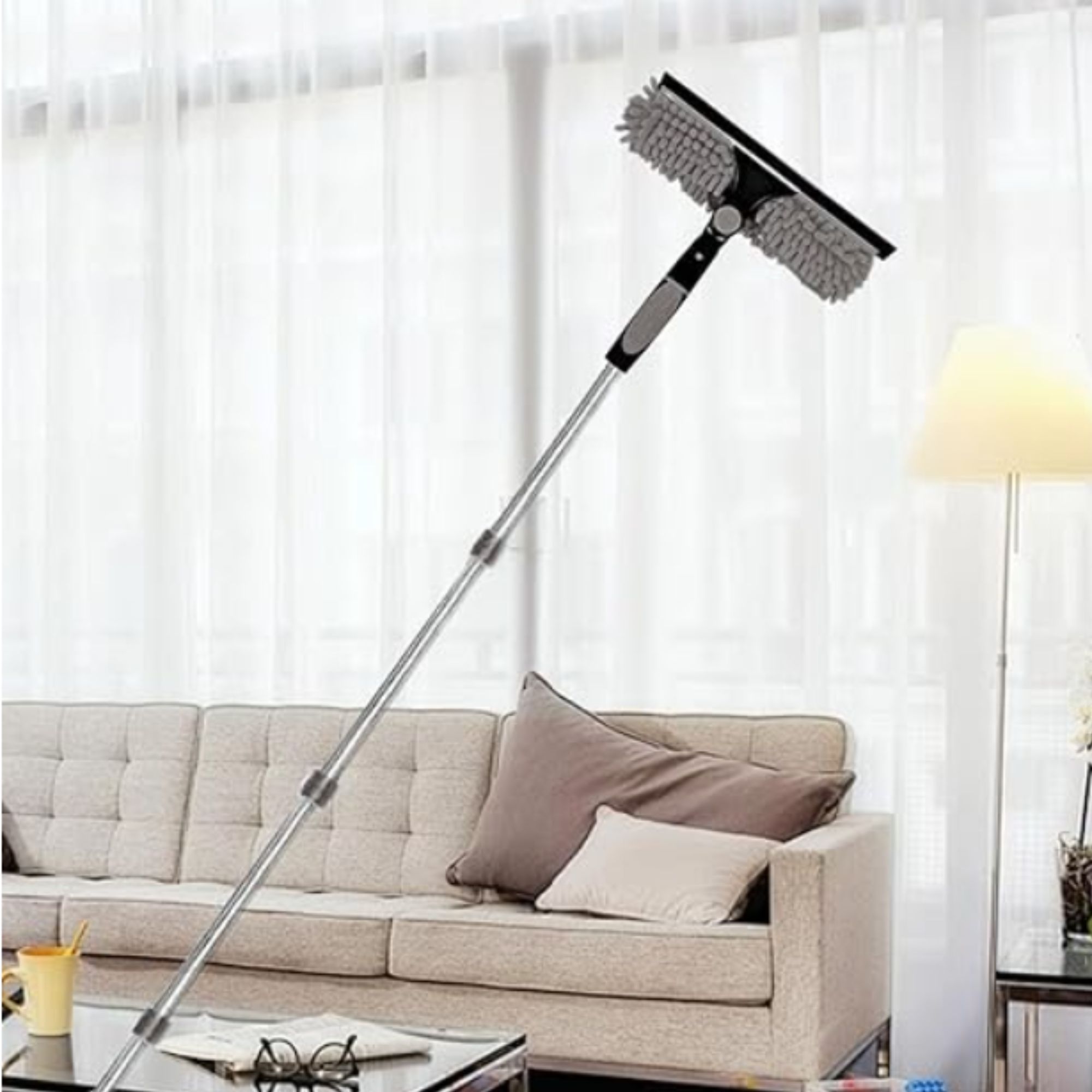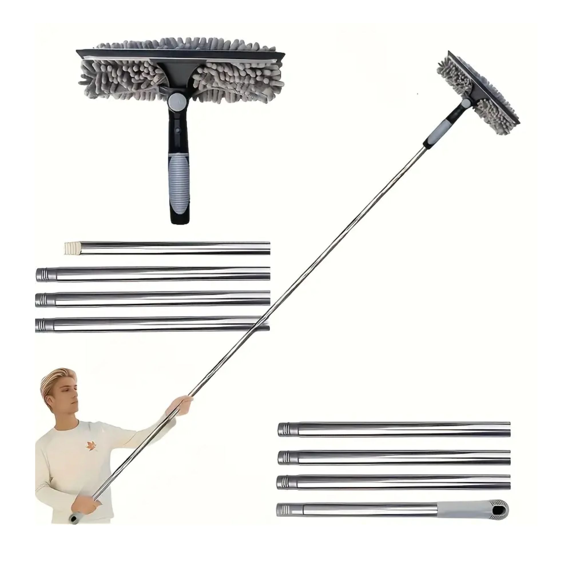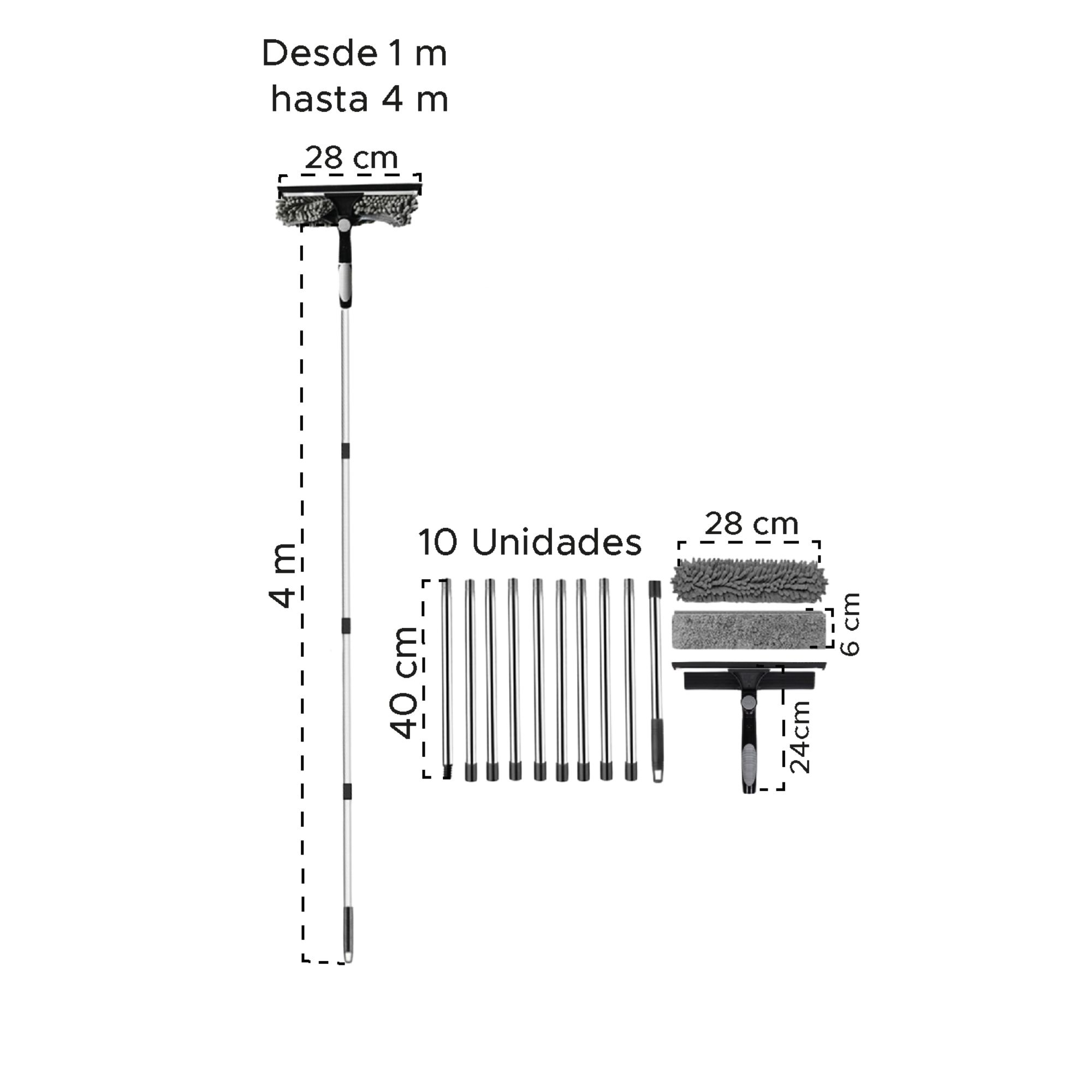 Este limpiador profesional está diseñado para llegar donde otros no llegan. Gracias a sus extensiones metálicas ajustables hasta 4 metros, podrás limpiar fácilmente ventanas, espejos, paredes y techos sin necesidad de escaleras 🏠✨