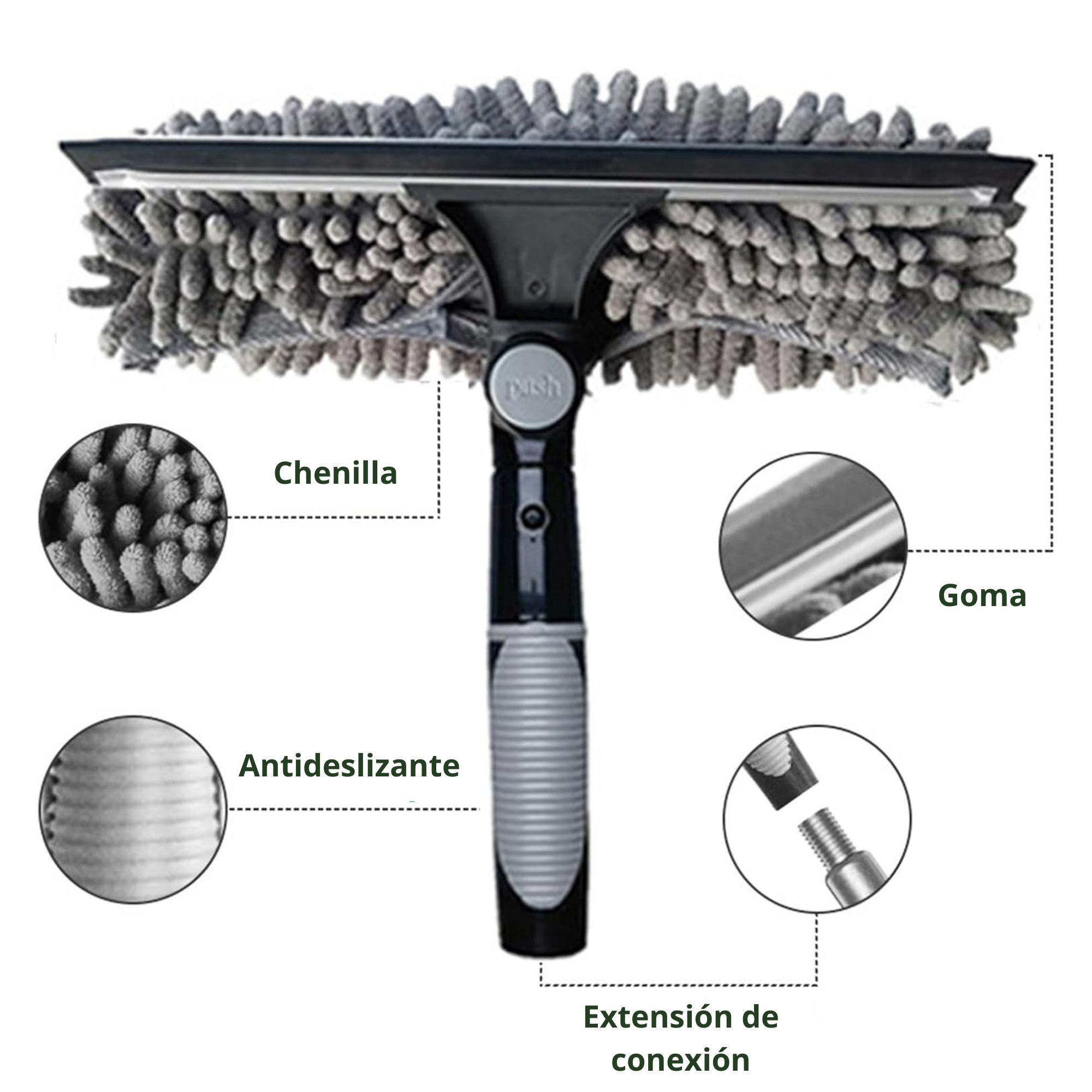 Incluye escobilla con mango ergonómico y dos tipos de microfibra de alta absorción, ideales para limpiar, secar y abrillantar sin dejar rayas. Su diseño práctico y multifuncional permite resultados impecables en menos tiempo 💪