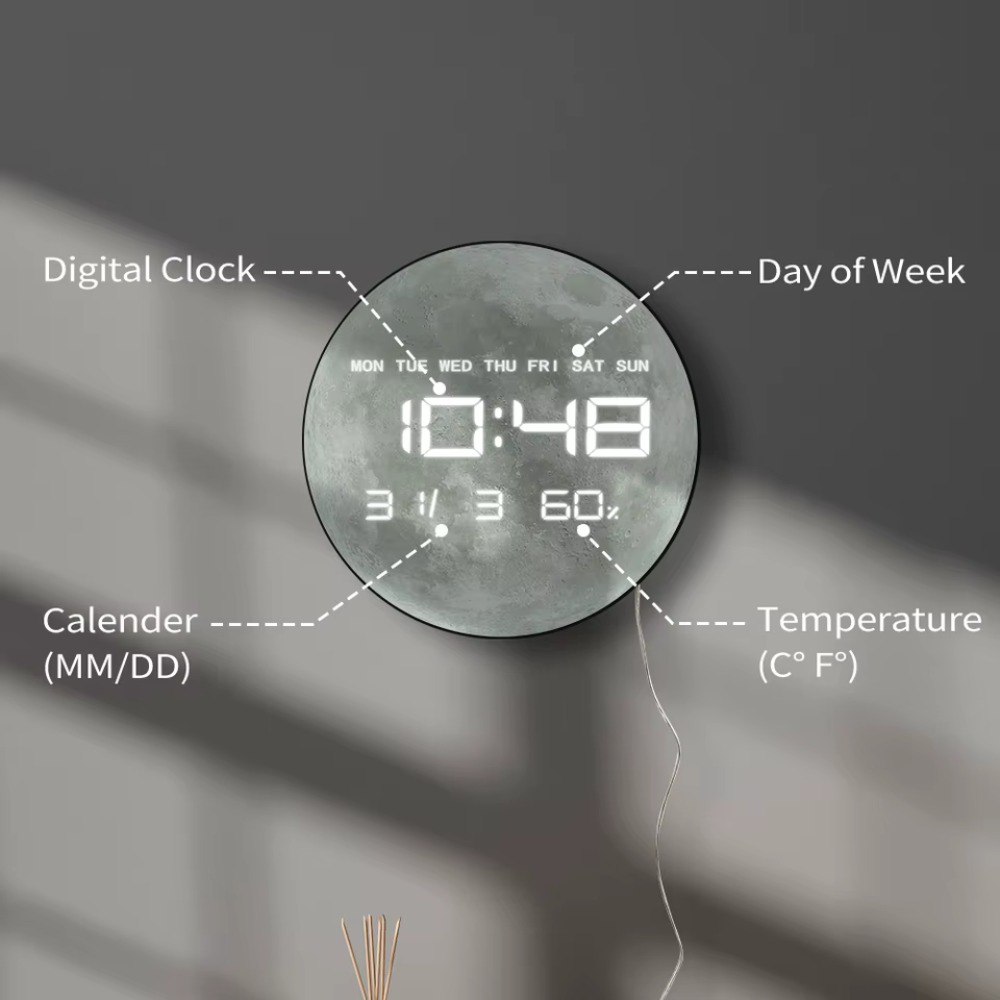 Su pantalla frontal muestra una impresión de alta calidad de la luna llena, sobre la cual resaltan los datos digitales en una luz LED blanca brillante, creando un efecto visual 3D impresionante.